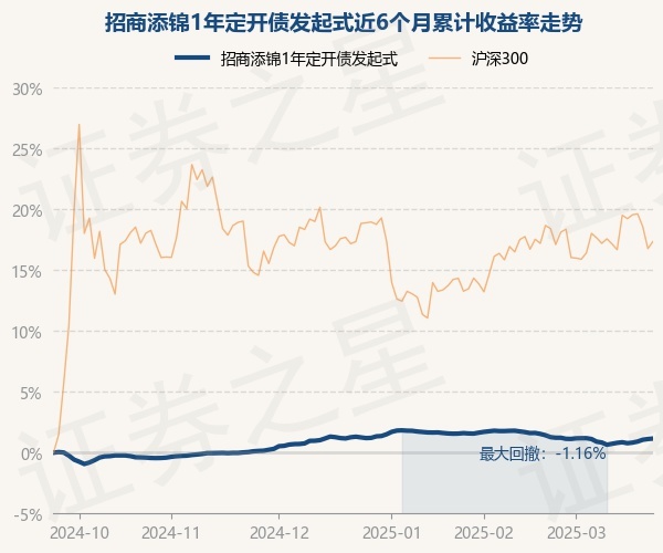 证券之星消息,3月24日,招商添锦1年定开债发起式最新单位净值为1.0324元,累计净值为1.1441元,较前一交易日上涨0.04%。历史数据显示该基金近1个月下跌0.12%,近3个月下跌0.09%,近6个月上涨1.16%,近1年上涨3.12%。该基金近6个月的累计收益率走势如下图: