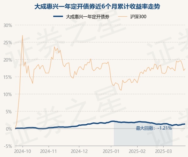 证券之星消息,3月24日,大成惠兴一年定开债券最新单位净值为1.0529元,累计净值为1.1744元,较前一交易日上涨0.05%。历史数据显示该基金近1个月上涨0.03%,近3个月下跌0.32%,近6个月上涨1.3%,近1年上涨4.39%。该基金近6个月的累计收益率走势如下图: