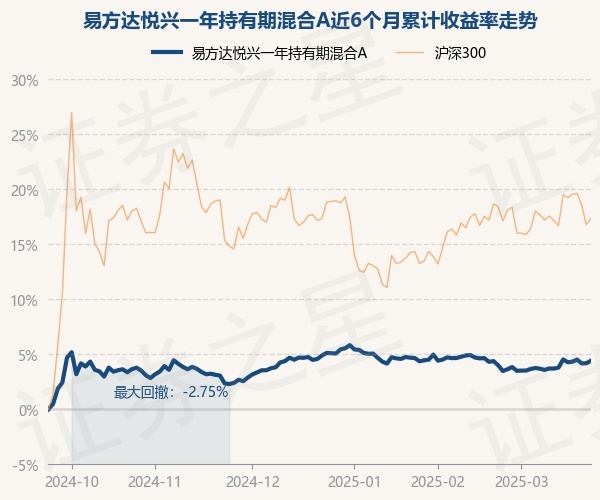 证券之星消息,3月24日,易方达悦兴一年持有期混合A最新单位净值为1.0331元,累计净值为1.0331元,较前一交易日上涨0.22%。历史数据显示该基金近1个月上涨0.41%,近3个月下跌0.67%,近6个月上涨4.42%,近1年上涨6.2%。该基金近6个月的累计收益率走势如下图: