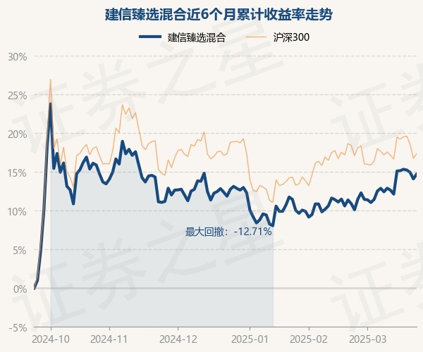 证券之星消息,3月24日,建信臻选混合最新单位净值为0.857元,累计净值为0.857元,较前一交易日上涨0.53%。历史数据显示该基金近1个月上涨3.43%,近3个月上涨1.73%,近6个月上涨14.71%,近1年上涨13.45%。该基金近6个月的累计收益率走势如下图: