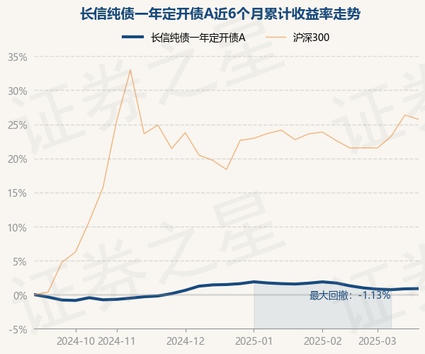 证券之星消息,3月24日,长信纯债一年定开债A最新单位净值为1.035元,累计净值为1.7118元,较前一交易日上涨0.03%。历史数据显示该基金近1个月下跌0.41%,近3个月下跌0.54%,近6个月上涨0.88%,近1年上涨3.63%。该基金近6个月的累计收益率走势如下图: