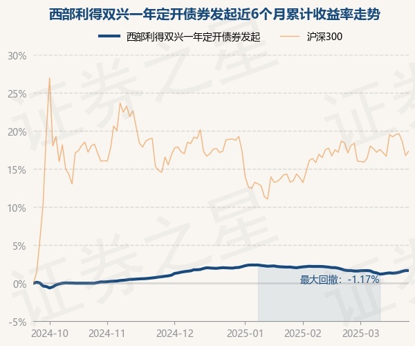 证券之星消息,3月24日,西部利得双兴一年定开债券发起最新单位净值为1.0519元,累计净值为1.0899元,较前一交易日上涨0.0%。历史数据显示该基金近1个月上涨0.04%,近3个月下跌0.26%,近6个月上涨1.76%,近1年上涨4.28%。该基金近6个月的累计收益率走势如下图: