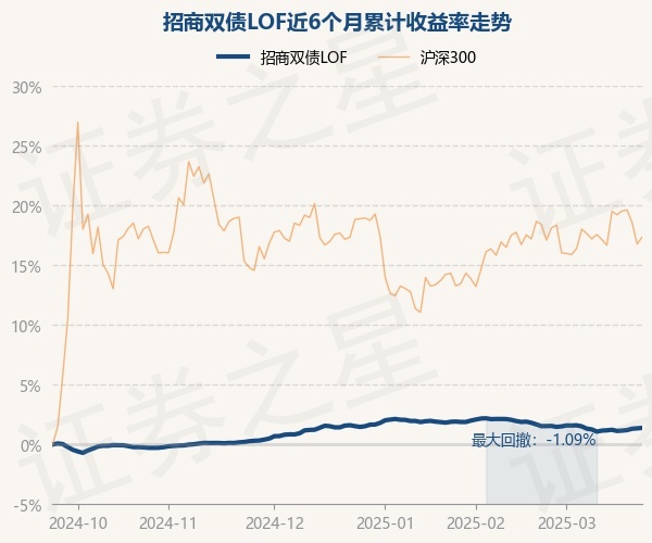 证券之星消息,3月24日,招商双债LOF最新单位净值为1.5913元,累计净值为1.7303元,较前一交易日上涨0.04%。历史数据显示该基金近1个月下跌0.14%,近3个月下跌0.14%,近6个月上涨1.39%,近1年上涨3.42%。该基金近6个月的累计收益率走势如下图: