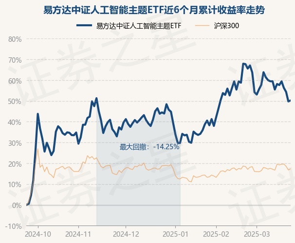 证券之星消息,3月24日,易方达中证人工智能主题ETF最新单位净值为0.9803元,累计净值为0.9803元,较前一交易日上涨0.3%。历史数据显示该基金近1个月下跌10.43%,近3个月上涨3.96%,近6个月上涨50.19%,近1年上涨25.52%。该基金近6个月的累计收益率走势如下图: