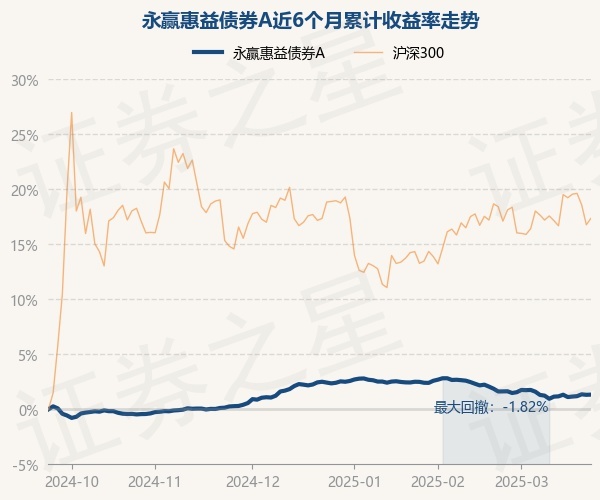 证券之星消息,3月24日,永赢惠益债券A最新单位净值为1.0979元,累计净值为1.2723元,较前一交易日上涨0.02%。历史数据显示该基金近1个月下跌0.28%,近3个月下跌1.07%,近6个月上涨1.33%,近1年上涨4.86%。该基金近6个月的累计收益率走势如下图: