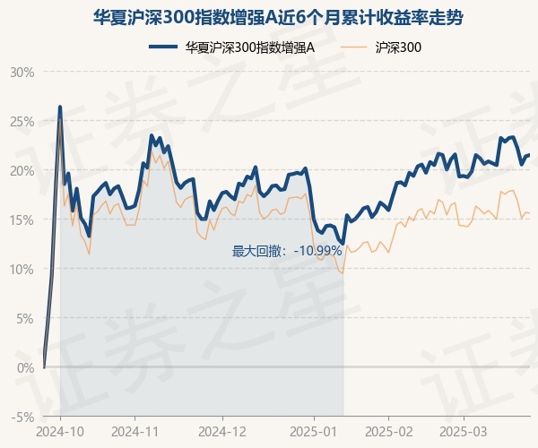 证券之星消息,3月25日,华夏沪深300指数增强A最新单位净值为1.889元,累计净值为1.889元,较前一交易日上涨0.11%。历史数据显示该基金近1个月上涨1.23%,近3个月上涨1.61%,近6个月上涨21.48%,近1年上涨19.78%。该基金近6个月的累计收益率走势如下图: