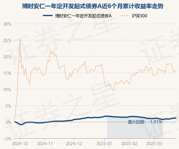 证券之星消息,3月25日,博时安仁一年定开发起式债券A最新单位净值为1.169元,累计净值为1.3367元,较前一交易日上涨0.05%。历史数据显示该基金近1个月上涨0.15%,近3个月下跌0.09%,近6个月上涨1.22%,近1年上涨2.78%。该基金近6个月的累计收益率走势如下图: