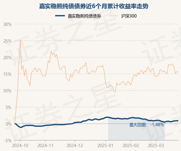 证券之星消息,3月25日,嘉实稳熙纯债债券最新单位净值为1.0215元,累计净值为1.2989元,较前一交易日上涨0.05%。历史数据显示该基金近1个月下跌0.02%,近3个月下跌0.26%,近6个月上涨0.9%,近1年上涨3.76%。该基金近6个月的累计收益率走势如下图: