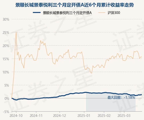 证券之星消息,3月25日,景顺长城景泰悦利三个月定开债A最新单位净值为1.035元,累计净值为1.1176元,较前一交易日上涨0.07%。历史数据显示该基金近1个月下跌0.23%,近3个月下跌0.53%,近6个月上涨1.35%,近1年上涨4.78%。该基金近6个月的累计收益率走势如下图: