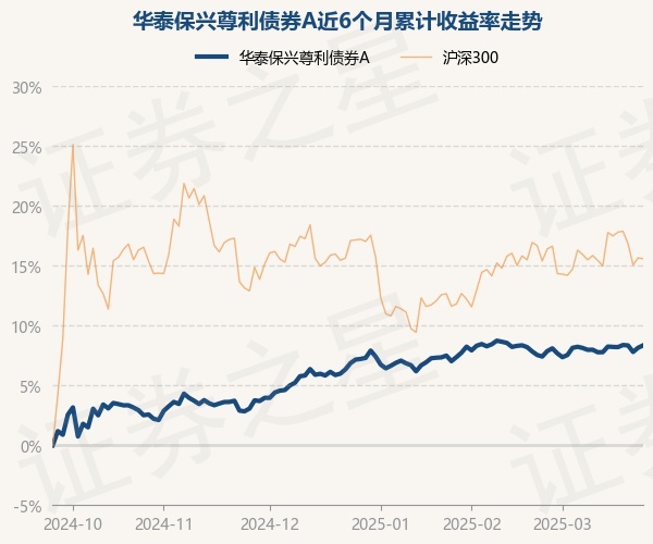 证券之星消息,3月25日,华泰保兴尊利债券A最新单位净值为1.236元,累计净值为1.4605元,较前一交易日上涨0.19%。历史数据显示该基金近1个月上涨0.87%,近3个月上涨1.11%,近6个月上涨8.38%,近1年上涨11.79%。该基金近6个月的累计收益率走势如下图: