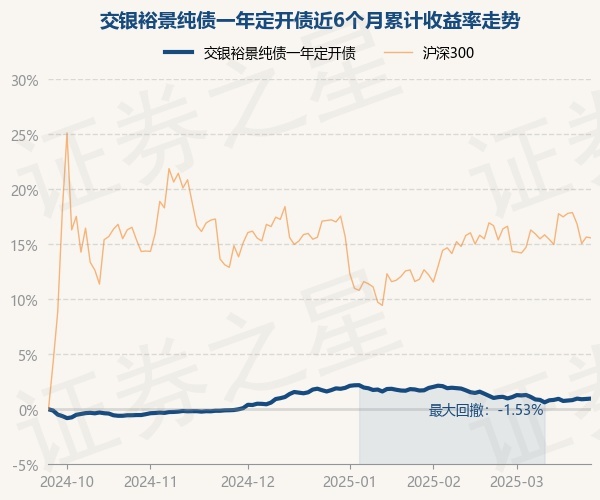 证券之星消息,3月25日,交银裕景纯债一年定开债最新单位净值为1.0414元,累计净值为1.1134元,较前一交易日上涨0.03%。历史数据显示该基金近1个月下跌0.13%,近3个月下跌0.64%,近6个月上涨0.97%,近1年上涨3.37%。该基金近6个月的累计收益率走势如下图: