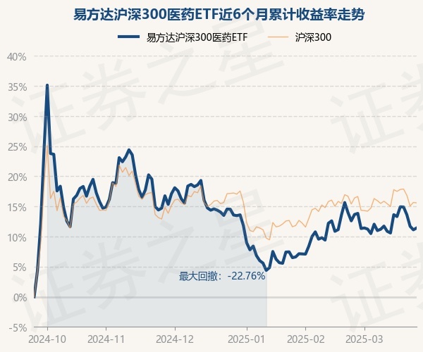 证券之星消息,3月25日,易方达沪深300医药ETF最新单位净值为0.359元,累计净值为1.436元,较前一交易日上涨0.28%。历史数据显示该基金近1个月下跌1.05%,近3个月下跌2.71%,近6个月上涨11.42%,近1年下跌2.55%。该基金近6个月的累计收益率走势如下图: