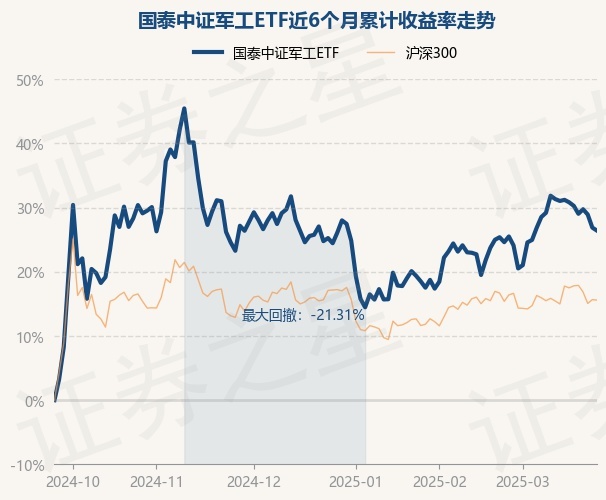 证券之星消息,3月25日,国泰中证军工ETF最新单位净值为1.0548元,累计净值为1.0548元,较前一交易日下跌0.37%。历史数据显示该基金近1个月上涨1.44%,近3个月上涨1.58%,近6个月上涨26.41%,近1年上涨18.92%。该基金近6个月的累计收益率走势如下图: