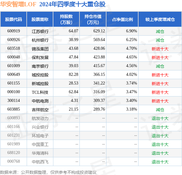 华安智增LOF为混合型-灵活基金,根据最新一期基金季报显示,该基金资产配置:股票占净值比78.99%,无债券类资产,现金占净值比19.7%。基金十大重仓股如下: