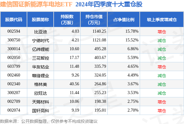 建信国证新能源车电池ETF为指数型-股票基金,根据最新一期基金季报显示,该基金资产配置:股票占净值比98.01%,无债券类资产,现金占净值比2.19%。基金十大重仓股如下: