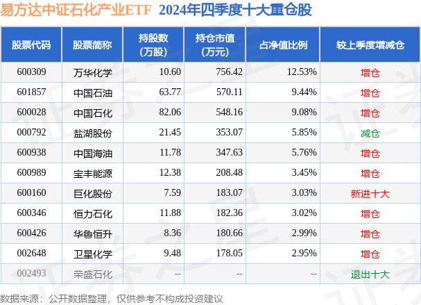 易方达中证石化产业ETF为指数型-股票基金,根据最新一期基金季报显示,该基金资产配置:股票占净值比98.83%,无债券类资产,现金占净值比1.14%。基金十大重仓股如下: