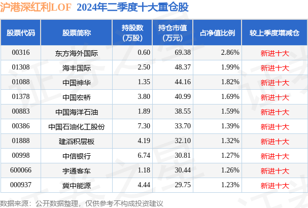 沪港深红利LOF为指数型-股票基金,根据最新一期基金季报显示,该基金资产配置:股票占净值比89.69%,无债券类资产,现金占净值比7.97%。基金十大重仓股如下: