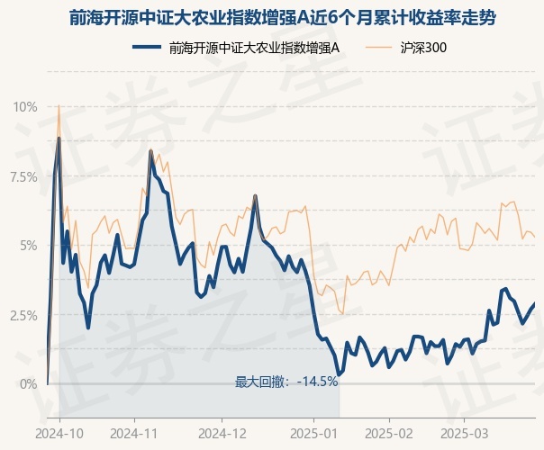 证券之星消息,3月26日,前海开源中证大农业指数增强A最新单位净值为0.9204元,累计净值为0.9204元,较前一交易日上涨0.35%。历史数据显示该基金近1个月上涨3.66%,近3个月下跌2.13%,近6个月上涨5.71%,近1年下跌3.43%。该基金近6个月的累计收益率走势如下图: