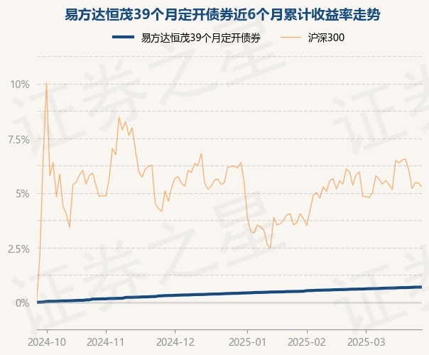 证券之星消息,3月26日,易方达恒茂39个月定开债券最新单位净值为1.0081元,累计净值为1.1436元,较前一交易日上涨0.01%。历史数据显示该基金近1个月上涨0.19%,近3个月上涨0.57%,近6个月上涨1.39%,近1年上涨2.67%。该基金近6个月的累计收益率走势如下图:
