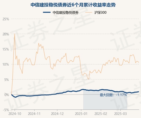 证券之星消息,3月26日,中信建投稳悦债券最新单位净值为1.0421元,累计净值为1.2151元,较前一交易日上涨0.06%。历史数据显示该基金近1个月下跌0.04%,近3个月下跌0.1%,近6个月上涨0.9%,近1年上涨2.87%。该基金近6个月的累计收益率走势如下图: