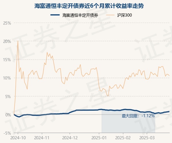 证券之星消息,3月26日,海富通恒丰定开债券最新单位净值为1.0324元,累计净值为1.2989元,较前一交易日上涨0.04%。历史数据显示该基金近1个月上涨0.1%,近3个月下跌0.41%,近6个月上涨0.77%,近1年上涨4.31%。该基金近6个月的累计收益率走势如下图: