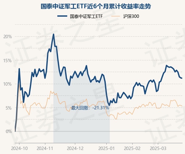 证券之星消息,3月26日,国泰中证军工ETF最新单位净值为1.0537元,累计净值为1.0537元,较前一交易日下跌0.1%。历史数据显示该基金近1个月上涨0.62%,近3个月上涨0.13%,近6个月上涨22.31%,近1年上涨19.37%。该基金近6个月的累计收益率走势如下图: