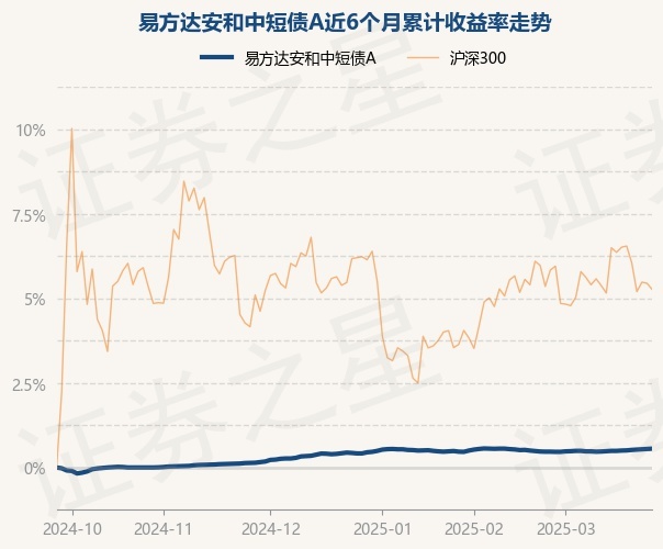 证券之星消息,3月26日,易方达安和中短债A最新单位净值为1.0696元,累计净值为1.1296元,较前一交易日上涨0.02%。历史数据显示该基金近1个月上涨0.18%,近3个月上涨0.28%,近6个月上涨1.12%,近1年上涨2.46%。该基金近6个月的累计收益率走势如下图: