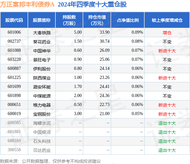 方正富邦丰利债券A为债券型-混合二级基金,根据最新一期基金季报显示,该基金资产配置:股票占净值比1.75%,债券占净值比110.1%,现金占净值比2.22%。基金十大重仓股如下: