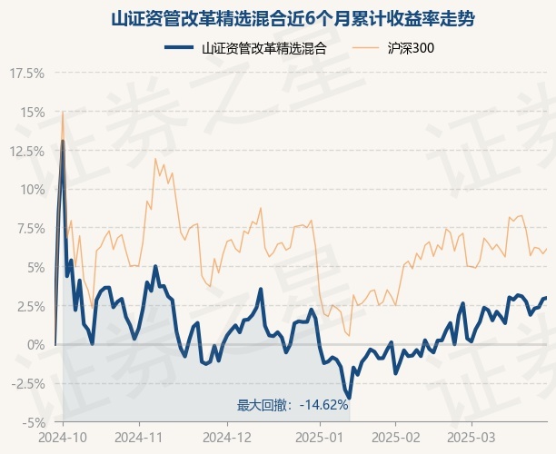 证券之星消息,3月27日,山证资管改革精选混合最新单位净值为1.0969元,累计净值为1.0969元,较前一交易日上涨0.07%。历史数据显示该基金近1个月上涨0.35%,近3个月上涨1.53%,近6个月上涨2.97%,近1年上涨4.2%。该基金近6个月的累计收益率走势如下图: