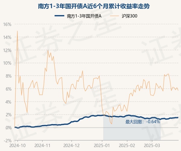 证券之星消息,3月27日,南方1-3年国开债A最新单位净值为1.0432元,累计净值为1.2032元,较前一交易日下跌0.01%。历史数据显示该基金近1个月上涨0.15%,近3个月下跌0.35%,近6个月上涨1.49%,近1年上涨3.16%。该基金近6个月的累计收益率走势如下图: