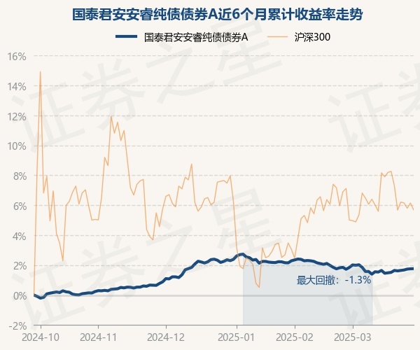 证券之星消息,3月27日,国泰君安安睿纯债债券A最新单位净值为1.0255元,累计净值为1.0605元,较前一交易日上涨0.02%。历史数据显示该基金近1个月上涨0.03%,近3个月下跌0.59%,近6个月上涨1.75%,近1年上涨4.31%。该基金近6个月的累计收益率走势如下图:
