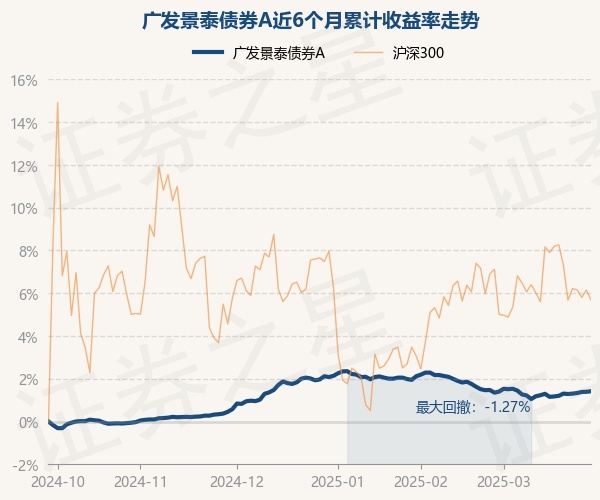 证券之星消息,3月27日,广发景泰债券A最新单位净值为1.0731元,累计净值为1.0731元,较前一交易日上涨0.01%。历史数据显示该基金近1个月上涨0.04%,近3个月下跌0.71%,近6个月上涨1.39%,近1年上涨3.8%。该基金近6个月的累计收益率走势如下图:
