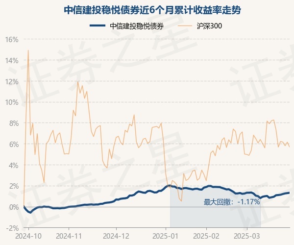 证券之星消息,3月27日,中信建投稳悦债券最新单位净值为1.0424元,累计净值为1.2154元,较前一交易日上涨0.03%。历史数据显示该基金近1个月上涨0.07%,近3个月下跌0.21%,近6个月上涨1.28%,近1年上涨2.89%。该基金近6个月的累计收益率走势如下图: