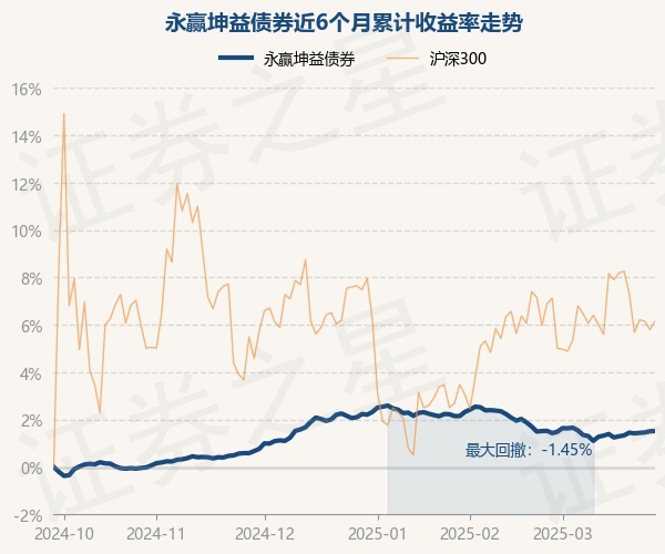 证券之星消息,3月27日,永赢坤益债券最新单位净值为1.0572元,累计净值为1.0842元,较前一交易日上涨0.01%。历史数据显示该基金近1个月上涨0.09%,近3个月下跌0.7%,近6个月上涨1.52%,近1年上涨3.74%。该基金近6个月的累计收益率走势如下图: