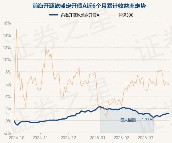 证券之星消息,3月27日,前海开源乾盛定开债A最新单位净值为1.0406元,累计净值为1.2728元,较前一交易日上涨0.02%。历史数据显示该基金近1个月上涨0.15%,近3个月下跌0.48%,近6个月上涨1.19%,近1年上涨3.36%。该基金近6个月的累计收益率走势如下图: