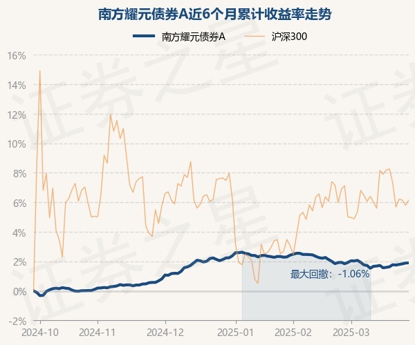 证券之星消息,3月27日,南方耀元债券A最新单位净值为1.0372元,累计净值为1.0702元,较前一交易日上涨0.01%。历史数据显示该基金近1个月上涨0.06%,近3个月下跌0.33%,近6个月上涨1.9%,近1年上涨3.2%。该基金近6个月的累计收益率走势如下图: