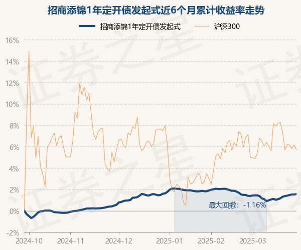 证券之星消息,3月27日,招商添锦1年定开债发起式最新单位净值为1.0336元,累计净值为1.1453元,较前一交易日上涨0.01%。历史数据显示该基金近1个月上涨0.14%,近3个月下跌0.06%,近6个月上涨1.53%,近1年上涨3.21%。该基金近6个月的累计收益率走势如下图: