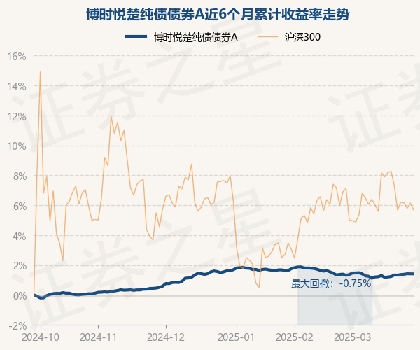 证券之星消息,3月28日,博时悦楚纯债债券A最新单位净值为1.0678元,累计净值为1.2578元,较前一交易日上涨0.0%。历史数据显示该基金近1个月上涨0.05%,近3个月下跌0.21%,近6个月上涨1.42%,近1年上涨3.4%。该基金近6个月的累计收益率走势如下图: