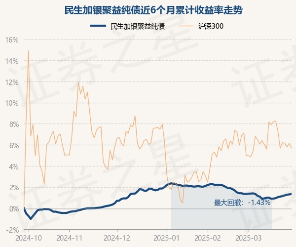 证券之星消息,3月28日,民生加银聚益纯债最新单位净值为1.0733元,累计净值为1.1884元,较前一交易日上涨0.03%。历史数据显示该基金近1个月上涨0.0%,近3个月下跌0.51%,近6个月上涨1.34%,近1年上涨3.65%。该基金近6个月的累计收益率走势如下图: