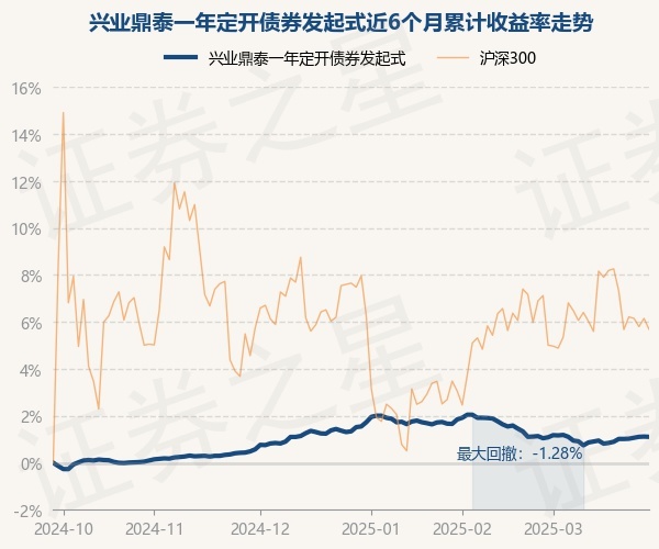 证券之星消息,3月28日,兴业鼎泰一年定开债券发起式最新单位净值为1.0097元,累计净值为1.1416元,较前一交易日下跌0.01%。历史数据显示该基金近1个月上涨0.02%,近3个月下跌0.41%,近6个月上涨1.11%,近1年上涨2.62%。该基金近6个月的累计收益率走势如下图: