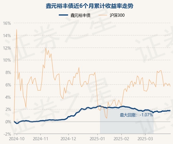 证券之星消息,3月28日,鑫元裕丰债最新单位净值为1.0959元,累计净值为1.1059元,较前一交易日上涨0.01%。历史数据显示该基金近1个月上涨0.03%,近3个月下跌0.49%,近6个月上涨1.75%,近1年上涨3.87%。该基金近6个月的累计收益率走势如下图: