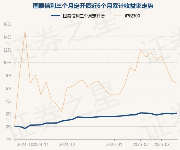 证券之星消息,3月28日,国泰信利三个月定开债最新单位净值为1.0401元,累计净值为1.2135元,较前一交易日上涨0.1%。历史数据显示该基金近1个月上涨0.27%,近3个月上涨0.54%,近6个月上涨2.06%,近1年上涨3.63%。该基金近6个月的累计收益率走势如下图: