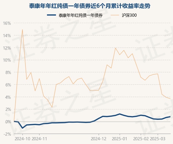 证券之星消息,3月28日,泰康年年红纯债一年债券最新单位净值为1.04元,累计净值为1.392元,较前一交易日上涨0.13%。历史数据显示该基金近1个月上涨0.37%,近3个月下跌0.09%,近6个月上涨0.77%,近1年上涨3.19%。该基金近6个月的累计收益率走势如下图: