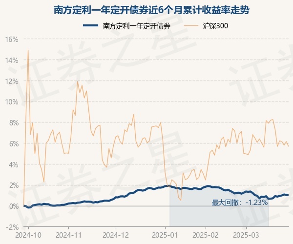 证券之星消息,3月28日,南方定利一年定开债券最新单位净值为1.0698元,累计净值为1.0998元,较前一交易日下跌0.02%。历史数据显示该基金近1个月下跌0.23%,近3个月下跌0.71%,近6个月上涨1.01%,近1年上涨2.72%。该基金近6个月的累计收益率走势如下图: