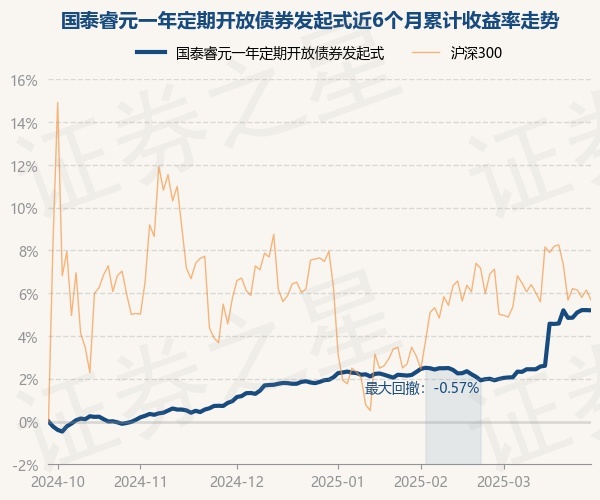 证券之星消息,3月28日,国泰睿元一年定期开放债券发起式最新单位净值为1.0422元,累计净值为1.1408元,较前一交易日下跌0.01%。历史数据显示该基金近1个月上涨3.15%,近3个月上涨3.21%,近6个月上涨5.2%,近1年上涨7.09%。该基金近6个月的累计收益率走势如下图: