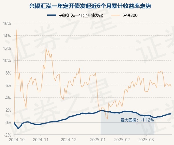 证券之星消息,3月28日,兴银汇泓一年定开债发起最新单位净值为1.0314元,累计净值为1.1039元,较前一交易日上涨0.04%。历史数据显示该基金近1个月上涨0.34%,近3个月下跌0.11%,近6个月上涨1.38%,近1年上涨2.71%。该基金近6个月的累计收益率走势如下图: