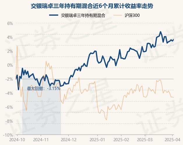 证券之星消息,3月31日,交银瑞卓三年持有期混合最新单位净值为0.9639元,累计净值为0.9639元,较前一交易日上涨0.24%。历史数据显示该基金近1个月上涨2.01%,近3个月上涨1.96%,近6个月上涨6.98%,近1年上涨13.19%。该基金近6个月的累计收益率走势如下图: