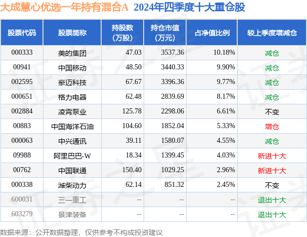 大成慧心优选一年持有混合A为混合型-偏股基金,根据最新一期基金季报显示,该基金资产配置:股票占净值比71.51%,无债券类资产,现金占净值比29.15%。基金十大重仓股如下: