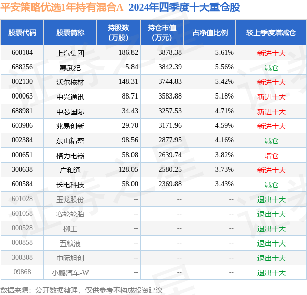 平安策略优选1年持有混合A为混合型-偏股基金,根据最新一期基金季报显示,该基金资产配置:股票占净值比89.96%,债券占净值比2.33%,现金占净值比7.73%。基金十大重仓股如下: