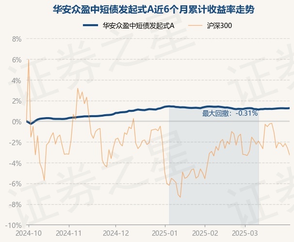 证券之星消息,3月31日,华安众盈中短债发起式A最新单位净值为1.0612元,累计净值为1.0612元,较前一交易日上涨0.02%。历史数据显示该基金近1个月上涨0.08%,近3个月下跌0.06%,近6个月上涨1.26%,近1年上涨2.27%。该基金近6个月的累计收益率走势如下图: